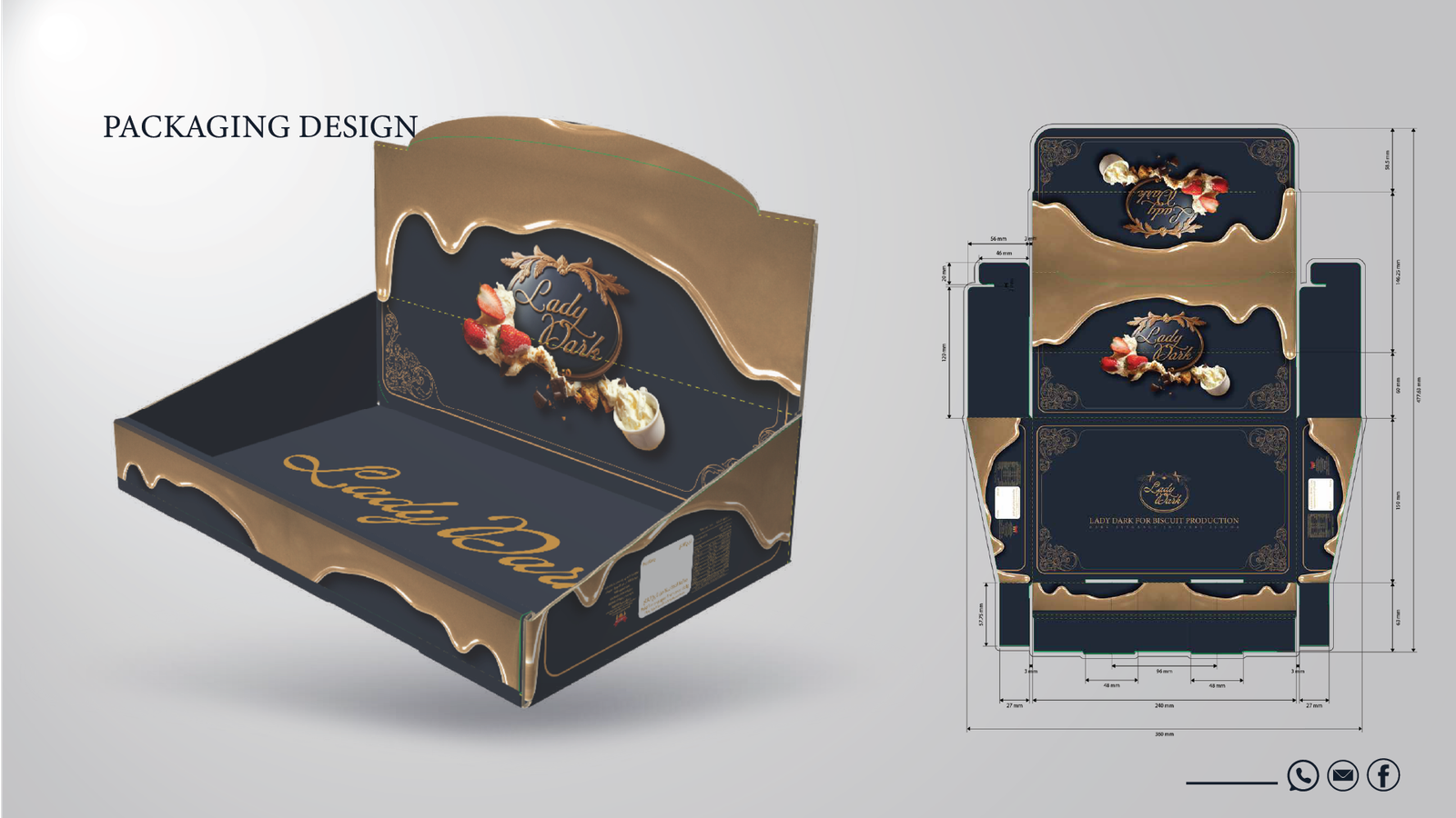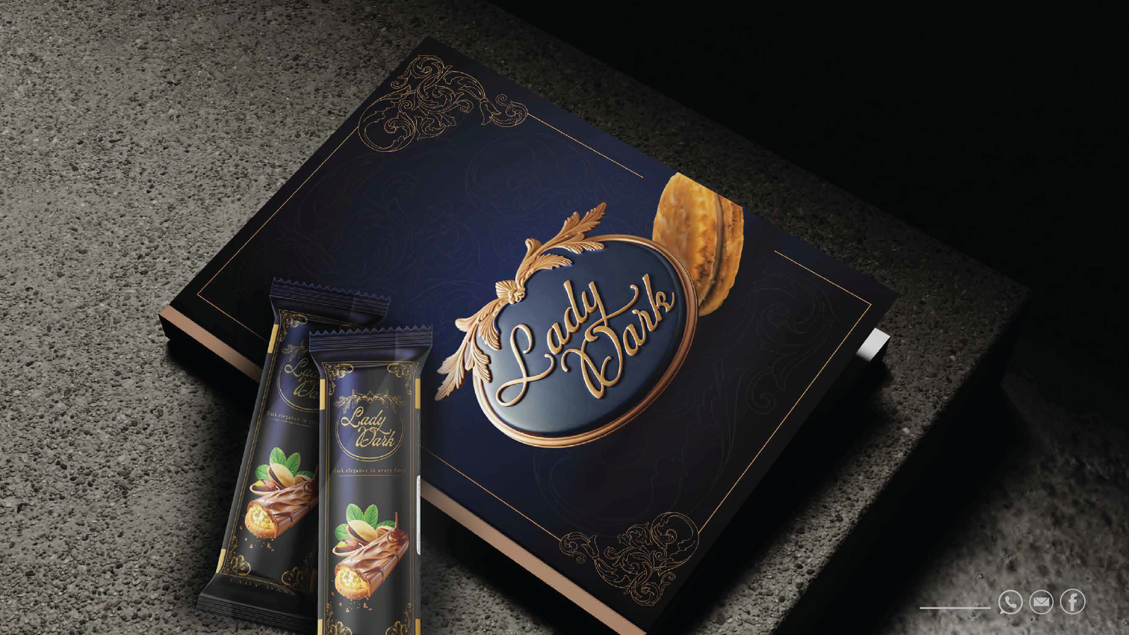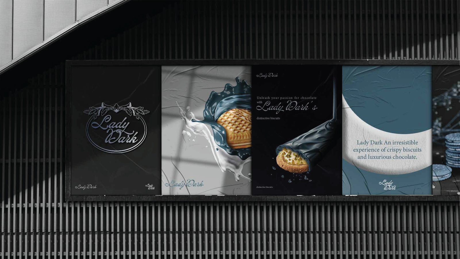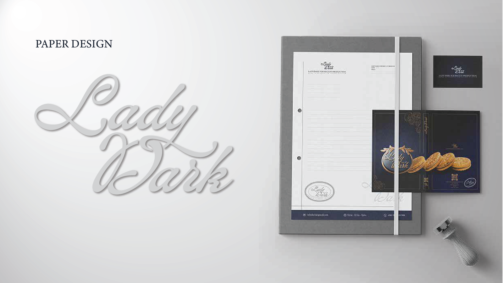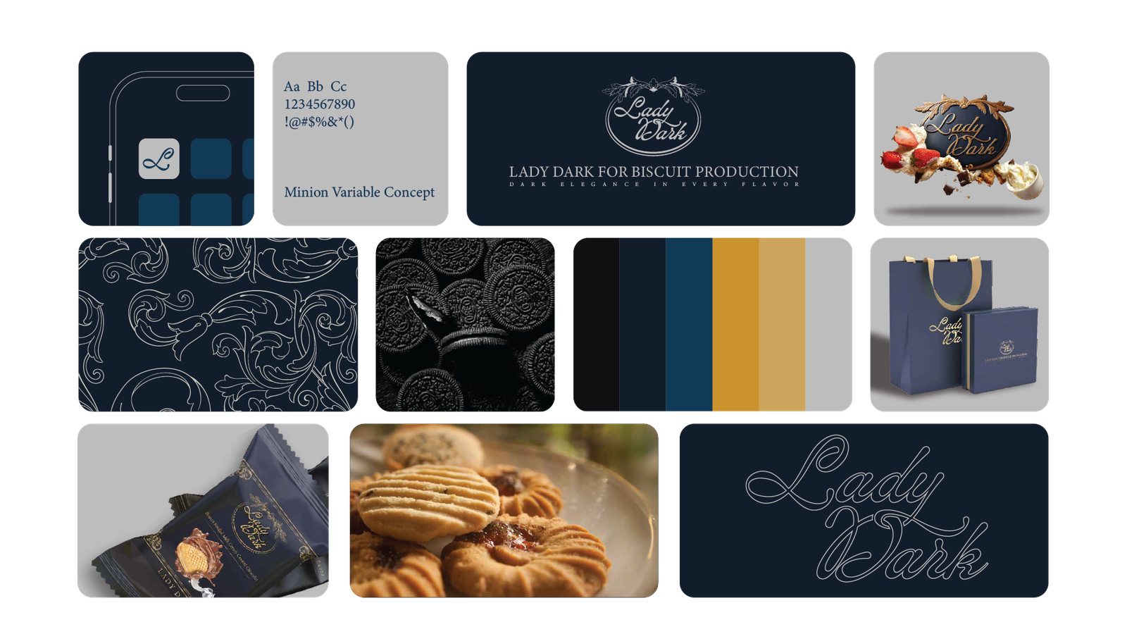 فلسفة التصميم: حيث تلتقي العراقة بالحداثة في Lady Dark، لم نصمم مجرد شعار، بل بنينا نظاماً بصرياً متكاملاً يعكس "الأناقة الداكنة" في كل تفصيلة. إليك كيف ترجمنا رؤية البراند إلى واقع ملموس: 1. المفهوم البصري (The Concept): اعتمدنا على الدمج بين الزخارف الكلاسيكية (Baroque/Floral Patterns) التي تعطي انطباعاً بالعراقة والفخامة، وبين الخطوط الانسيابية الحديثة. الهدف هو خلق براند "خالد" (Timeless) يخاطب حواس العميل قبل تذوق المنتج. 2. لوحة الألوان (Color Palette): تم اختيار الألوان بعناية فائقة لتعزيز الشعور بالـ "Premium": Deep Navy & Midnight Blue: ليعطي عمقاً، استقراراً، وفخامة لا تضاهى. Gold & Sand Tones: لإضافة لمسة من الإشراق والتباين العالي، مما يوحي بالجودة الذهبية للمكونات. Neutral Grey: لتحقيق التوازن البصري وجعل الهوية مريحة للعين في القنوات الرقمية. 3. الخطوط والتايبوجرافي (Typography): استخدمنا خط Minion Variable Concept وخطوطاً مخصصة (Custom Script) للشعار: الخطوط المنحنية في كلمة "Lady Dark" تعكس النعومة والانسيابية، بينما تعطي الخطوط "السيريف" (Serif) في النصوص الفرعية طابعاً رسمياً وجاداً يعزز من موثوقية البراند كشركة إنتاج بسكويت عالمية. 4. التغليف وتجربة المستخدم (Packaging & UX): النمط الزخرفي (Patterns): قمنا بتصميم أنماط فنية تُستخدم في التغليف وداخل التطبيقات الرقمية لتعزيز الـ Brand Recall (تذكر العلامة). التطبيق الرقمي: تم تصميم أيقونات وواجهات تطبيق الهاتف ببساطة متناهية (Minimalist) لتسهيل رحلة العميل في الطلب، مع الحفاظ على روح الهوية الداكنة والأنيقة. النتيجة: هوية بصرية لا تكتفي ببيع "بسكويت"، بل تبيع "تجربة فخمة" تبدأ من شكل العلبة وتنتهي بلذة المذاق.